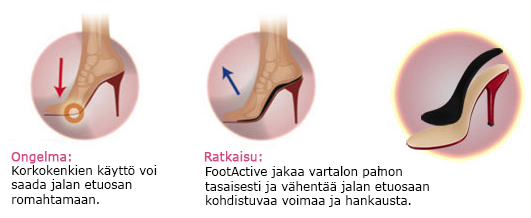 Syntyvä ylimääräinen kuormitus ja hankaus saattavat aiheuttaa yleisiä ongelmia: jalkapöydän kipuja (metatarsalgia) ja Mortonin neuroomaa, kovettumia ja liikavarpaita sekä särkyä ja väsymystä säärissä. FootActive Catwalk -pohjalliset tukevat jalkaholvia ja päkiää. Ruumiinpaino jakautuu tasaisemmin, ja jalan etuosaan kohdistuu vähemmän painetta ja voimaa – kävelystä tulee mukavampaa!